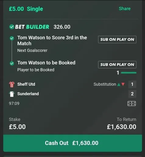 เหตุการณ์เกิดขึ้นตามที่เดิมพันไว้ทุกประการ — วัตสัน ปีกดาวรุ่งวัย 19 ปี สวมบทฮีโร่ยิงประตูชัยในช่วงทดเจ็บ ก่อนถอดเสื้อฉลองและรับใบเหลืองทันที ส่งผลให้แฟนบอลผู้โชคดีรายนี้รับทรัพย์ก้อนโตทันทีหลังจบเกม