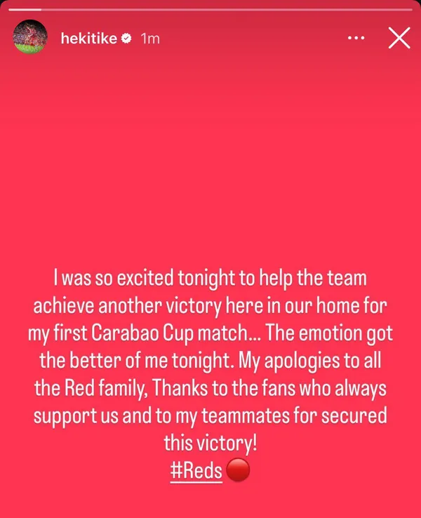 เอกิติเก้ โพสต์ผ่าน อินสตาแกรม เครือข่ายสังคมออนไลน์ชื่อดังว่า "คืนนี้ผมตื่นเต้นมากๆ ที่ได้ช่วยให้ทีมเก็บชัยชนะในบ้านของเราได้อีกนัดกับการลงเล่นเกม คาราบาว คัพ นัดแรกของผม คืนนี้ผมโดนอารมณ์พาไป ผมขอโทษครอบครัว เร้ด ทุกคนด้วย รวมถึงขอขอบคุณแฟนบอลที่สนับสนุนเราอยู่เสมอ และขอขอบคุณเหล่าเพื่อนร่วมทีมของผมที่ช่วยเก็บชัยชนะนัดนี้มาได้! #Reds"