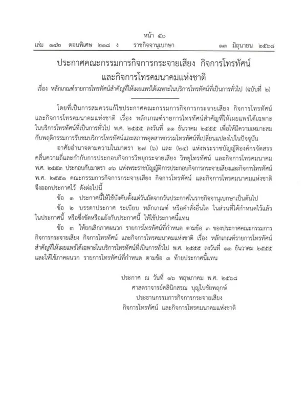 ราชกิจจานุเบกษา เผยแพร่ ประกาศคณะกรรมการกิจการกระจายเสียง กิจการโทรทัศน์ และกิจการโทรคมนาคมแห่งชาติ (กสทช.) ฉบับใหม่ เมื่อวันที่ 13 มิถุนายน 2568 โดยมีผล "ตัดฟุตบอลโลกรอบสุดท้าย" ออกจากรายการโทรทัศน์ที่เข้าหลักเกณฑ์ Must Have ซึ่งหมายถึงรายการที่ผู้ถือครองสิทธิ์ต้องเปิดให้ประชาชนรับชมได้ฟรีทางทีวีดิจิทัล