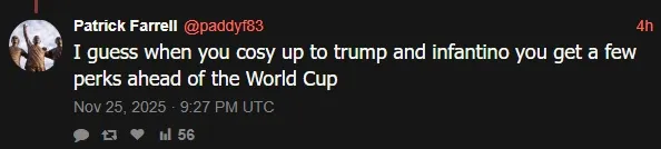 แฟนบอลหลายคนในอินเตอร์เน็ตตำหนิสหพันธ์ฟุตบอลนานาชาติ (ฟีฟ่า) หลังจากที่มีการประกาศว่า คริสเตียโน่ โรนัลโด้ กัปตันทีมชาติโปรตุเกสจะลงเล่น ฟุตบอลโลก 2026 ได้ตั้งแต่นัดแรก