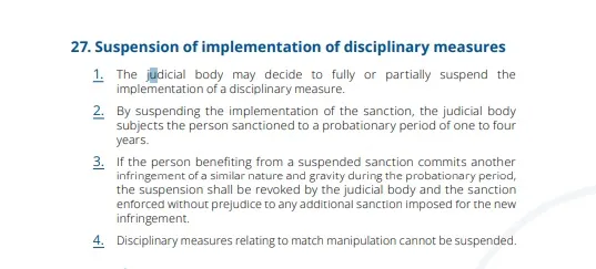หากอ้างอิงจากกฎของ ฟีฟ่า แล้วนั้น มันมีข้อ 27 ที่ระบุว่าคณะกรรมการพิจารณาคดีขององค์กรสามารถตัดสินระงับโทษแบนบางส่วนหรือทั้งหมดได้ โดยระยะเวลาการภาคทัณฑ์จะอยู่ที่ 1-4 ปี และหากมีการทำผิดแบบเดิมภายในระยะเวลาภาคทัณฑ์มันก็จะทำให้โทษแบนกลับมามีผลใช้งาน