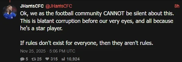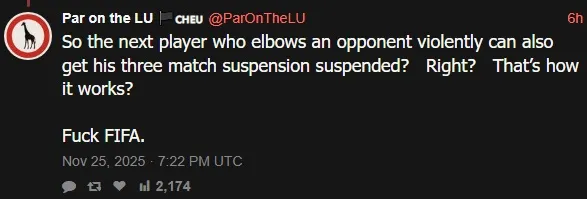 เรื่องดังกล่าวทำให้แฟนบอลหลายคนไม่พอใจสุดๆ อย่างเช่นข้อความที่บอกว่า "โทษแบน 3 นัดแบบที่มีภาคทัณฑ์เนี่ยนะ นี่มันเหมือนกับว่า ฟีฟ่า บอกกับ โรนัลโด้ ว่า -เรารู้ว่านายจะทำอีก แค่อย่าพยายามทำให้มันโจ่งแจ้งเกินไปภายใน 1 ปีนี้ก็พอ- เลย ไอ้เงื่อนไขที่บอกว่า -กรณีที่คล้ายกัน- มันตีความให้เข้าทางได้เยอะ", "ถ้างั้นนักเตะคนต่อไปที่ศอกใส่คู่แข่งแบบรุนแรงก็มีโอกาสที่จะให้โทษแบน 3 นัดถูกภาคทัณฑ์ได้เหมือนกันใช่ป่ะ ? มันทำงานแบบนั้นใช่ไหม ? ฟีฟ่า เวรตะไล", "โอเค พวกเราในฐานะชุมชนฟุตบอลจะเงียบเกี่ยวกับเรื่องนี้ไม่ได้เด็ดขาด นี่มันเท่ากับว่าเกิดเรื่องทุจริตต่อหน้าเราเลยนะ และมันเกิดขึ้นเพียงแค่เพราะเขาเป็นนักเตะคนดัง ถ้ากฎมันไม่ถูกใช้อย่างเท่าเทียมกับทุกคนมันก็แปลว่าไม่มีกฎอะไรทั้งนั้น" และ "เดาว่าเมื่อใครสักคนซี้กับ ทรัมป์ และ อินฟานติโน่ แล้วเนี่ย คนๆ นั้นก็จะได้สิทธิ์พิเศษบางอย่างก่อนถึง ฟุตบอลโลก ล่ะนะ" เป็นต้น