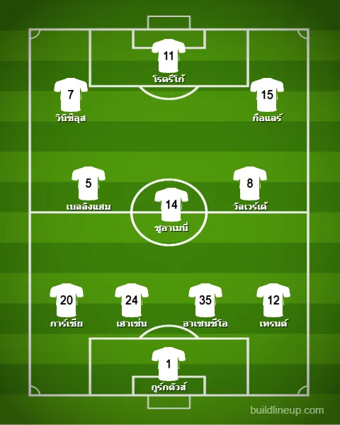 อลอนโซ่ น่าจะเลือกใช้งานแข้งพลังหนุ่ม และคงจัดเต็มด้วยการส่ง เบลลิงแฮม ลงบู๊ร่วมกับ วัลเวร์เด้ และ ชูอาเมนี่ ส่วนจอมเก๋าอย่าง ลูก้า โมดริช นั่งสำรอง ขณะที่ เอดูอาร์โด กามาวินก้า ยังไม่ฟิตสมบูรณ์