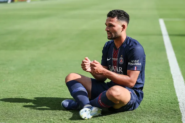 กอนซาโล่ รามอส กองหน้าชาวโปรตุกีสของ ปารีส แซงต์-แชร์กแมง ฉลองประตูด้วยท่านั่งเล่นเกมแบบ ดีโอโก้ โชต้า กองหน้าเพื่อนร่วมชาติผู้ล่วงลับ หลังกดประตูปิดท้ายช่วย เปแอสเช ถล่ม เรอัล มาดริด 4-0 ในศึก ฟีฟ่า คลับ เวิลด์ คัพ 2025 รอบรองชนะเลิศ ที่เมืองอีสต์ รัทเธอร์ฟอร์ด รัฐนิว เจอร์ซีย์ ประเทศสหรัฐอเมริกา เมื่อวันพุธที่ 9 กรกฎาคม ที่ผ่านมา