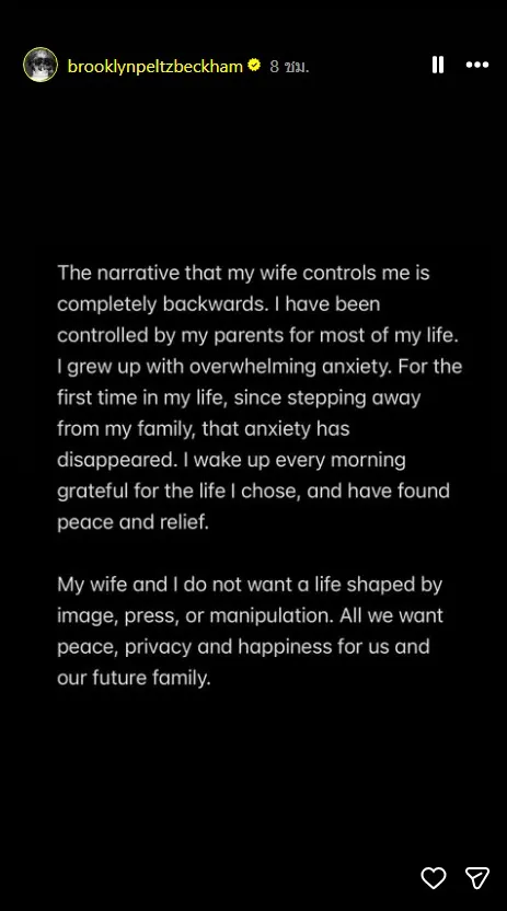 บรู๊คลิน เบ็คแฮม เปิดใจผ่านโซเชียล โจมตี เดวิด และ วิคตอเรีย เบ็คแฮม อย่างรุนแรง ยืนยันไม่คิดคืนดีกับครอบครัว ชี้ชีวิตหลังออกห่างมีความสุขและสงบมากที่สุดเท่าที่เคยมี