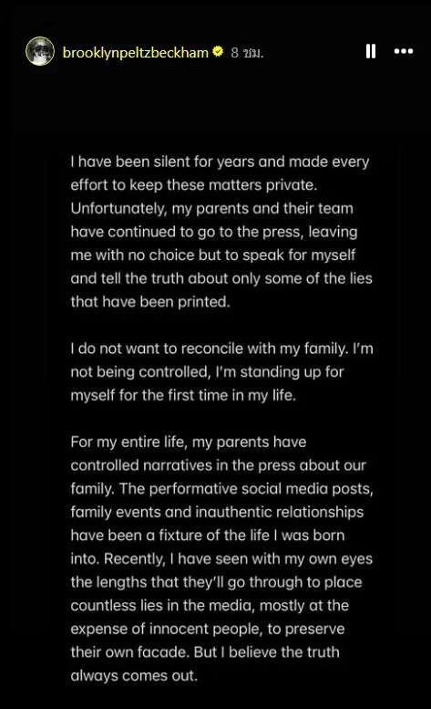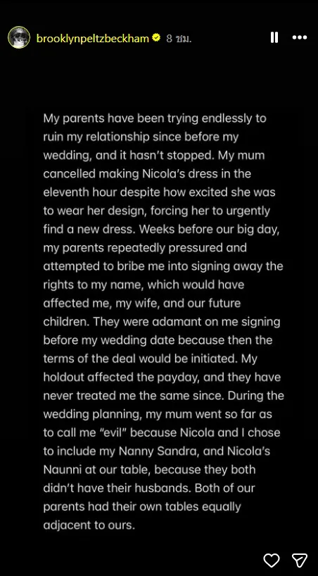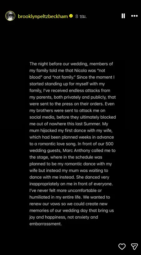 กระทั่งล่าสุด บรู๊คลิน ก็โพสต์ผ่าน อินสตาแกรม สตอรี่ แบบยาวเหยียด โดยส่วนหนึ่งนั้นเขาอ้างว่า เบ็คแฮม กับ วิคตอเรีย ปฏิบัติกับเขาแย่ๆ ทั้งในช่วงก่อนแต่งงานกับ เพลท์ซ และในช่วงจัดพิธี โดยเฉพาะ วิคตอเรีย ที่ถึงขั้นเคยยกเลิกชุดเจ้าสาวก่อนเริ่มงานไม่นาน