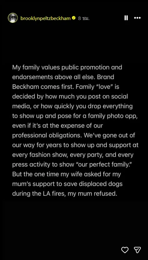 บรู๊คลิน เบ็คแฮม ลูกชายของ เดวิด เบ็คแฮม กับ วิคตอเรีย เบ็คแฮม โพสต์ด่าคุณพ่อกับคุณแม่ของตัวเองอย่างหนักรวมถึงบอกว่าไม่คิดที่จะกลับไปคืนดีกับครอบครัวอีก