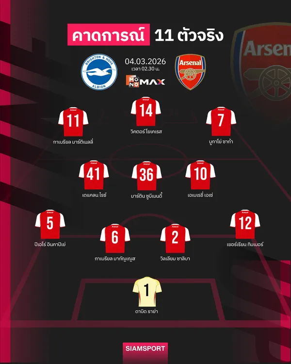สถานการณ์ของ โอเดอการ์ด ยังไม่ค่อยดีเท่าไหร่ และ อาร์เตต้า คงไม่เสี่ยงจับลงเป็นตัวจริง ขณะที่ ไค ฮาแวร์ตซ์ แม้จะหายเจ็บและถูกส่งเป็นตัวสำรองในเกมชนะ เชลซี แต่ก็ยังต้องระมัดระวังเอาไว้ก่อน ดังนั้นหน้าที่ในการปั้นเกมยังคงเป็นของ เอเซ่ ต่อไป ในส่วนของ ซาก้า ที่ฟอร์มกำลังขึ้นหม้อสุดๆ และอันตรายทุกครั้งที่ได้ครองบอล จะลงไปสร้างความปั่นป่วนทางฝั่งซ้าย แต่ที่คาดว่าจะมีการปรับคงเป็นฝั่งขวา เพราะ เลอันโดร ทรอสซาร์ ฟอร์มดร็อปลงไปเยอะ และให้โอกาส มาร์ติเนลลี่ ที่ผลงานเด่นเหลือเกินในช่วงหลังๆ ออกสตาร์ท 11 คนแรก