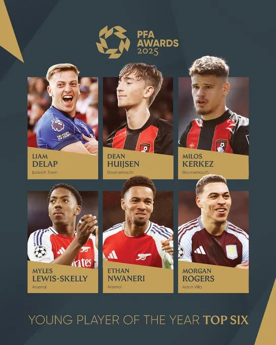 สมาคมนักฟุตบอลอาชีพอังกฤษ (พีเอฟเอ) ประกาศรายชื่อผู้เข้าชิงรางวัลนักเตะดาวรุ่งยอดเยี่ยมแห่งปี 2025 โดยมี 6 แข้งวัยหนุ่มฟอร์มแรงนำโดย เลียม ดีแลป กองหน้าป้ายแดงของเชลซี และ ไมล์ส ลูอิส-สเกลลี่ แบ็กซ้ายอนาคตไกลจาก อาร์เซน่อล