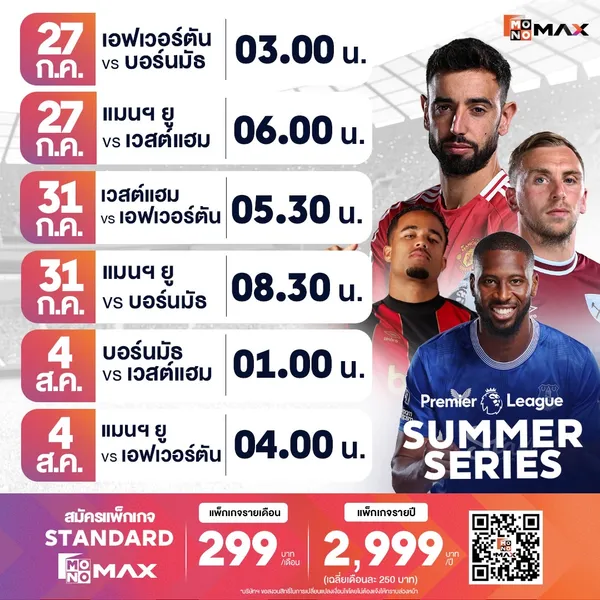 ติดตามความมันส์แบบจัดเต็ม พร้อมเชียร์ทีมรักแบบไม่สะดุดครบทุกแมตช์ได้ทาง Monomax และสามารถสมัครชมฟุตบอลพรีเมียร์ลีกกับแพ็กเกจสุดคุ้ม Monomax Standard รายเดือนเพียงแค่ 299 บาท และรายปีราคา 2,999 บาท (เฉลี่ยเดือนละ 250 บาท) เท่านั้น!!! หรือคลิกได้ที่ https://www.monomax.me/qr/vXt4