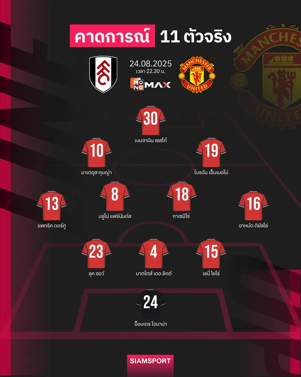 แมนฯ ยูไนเต็ด เตรียมเยือน ฟูแล่ม ศึกพรีเมียร์ลีก 24 ส.ค. รูเบน อโมริม จ่อปรับสามตำแหน่ง เบนจามิน เซสโก้ ได้ออกสตาร์ตแนวรุก ร่วมมาเตอุส คุนญ่า และ ไบรอัน เอ็มเบอโม่