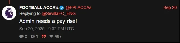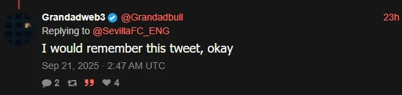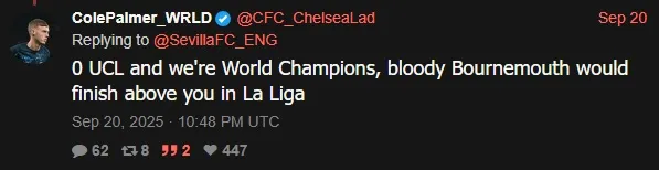 ทั้งนี้ หลังจากล่าสุด เชลซี ออกไปแพ้ แมนยูไนเต็ด แล้วนั้น แอคเคาท์ ทวิตเตอร์ เวอร์ชั่นภาษาของอังกฤษของ เซบีย่า ก็โพสต์ว่า "ครั้งล่าสุดที่ชนะที่ โอลด์ แทร็ฟฟอร์ด เซบีย่า 2018, เชลซี 2013 (เราไม่ได้เล่นใน พรีเมียร์ลีก ด้วยนะ)" ซึ่งมันก็มีคนกด "ถูกใจ" ราว 100,000 ครั้งเลยทีเดียว