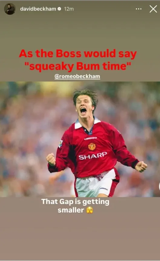ทั้งนี้ หลังจบเกมนัดล่าสุด เบ็คแฮม ก็โพสต์รูปสมัยที่ตัวเองยังเล่นให้ แมนยูไนเต็ด ลงบน อินสตาแกรม พร้อมพิมพ์ข้อความถึงลูกชายทันทีว่า "โอเคไหมอ่ะ โรเมโอ ??" พร้อมกับใส่อีโมจิหัวใจสีแดง, สีดำ และสีขาวเข้าไปด้วย