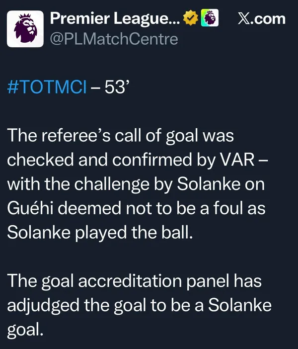 ทั้งนี้พรีเมียร์ลีกชี้แจงจังหวะกังกล่าวผ่าน@PLMatchCentre ระบุว่า พรีเมียร์ลีก ยืนยันคำตัดสินประตูของ โดมินิก โซลันกี้ ในนาทีที่ 53 เป็นประตูที่ใสสะอาด หลังจากเช็ก VAR แล้ว จังหวะระหว่าง โซลันกี้ กับ เกฮี ไม่ถือเป็นการฟาวล์ เพราะโซลันกี้ตั้งใจเล่นที่บอลชัดเจน