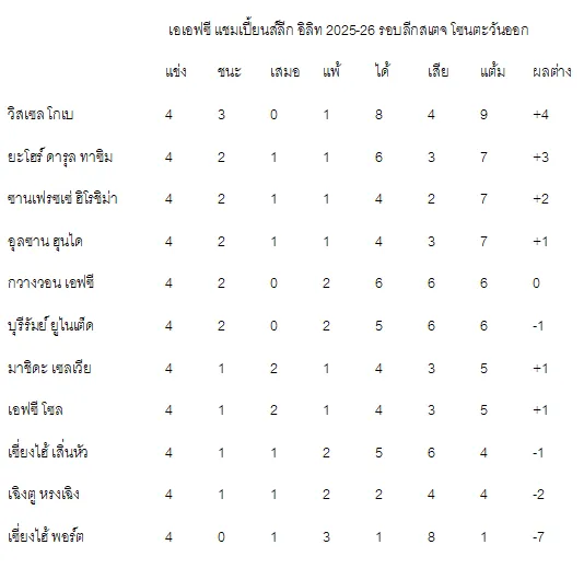ศึกฟุตบอลชิงแชมป์สโมสรเอเชีย รายการ เอเอฟซี แชมเปี้ยนส์ลีก อิลิท 2025-26 รอบลีกสเตจ ทำการแข่งขันไปแล้ว 4 นัด เริ่มเห็นทีมในการลุ้นเข้ารอบชัดเจนมากขึ้น