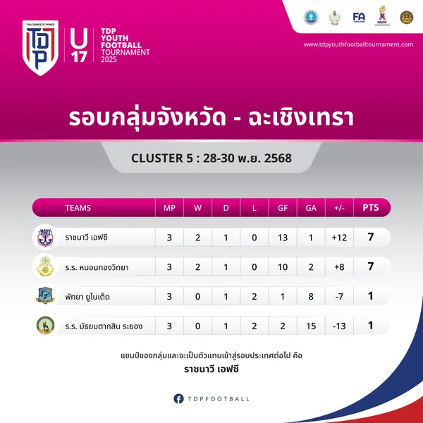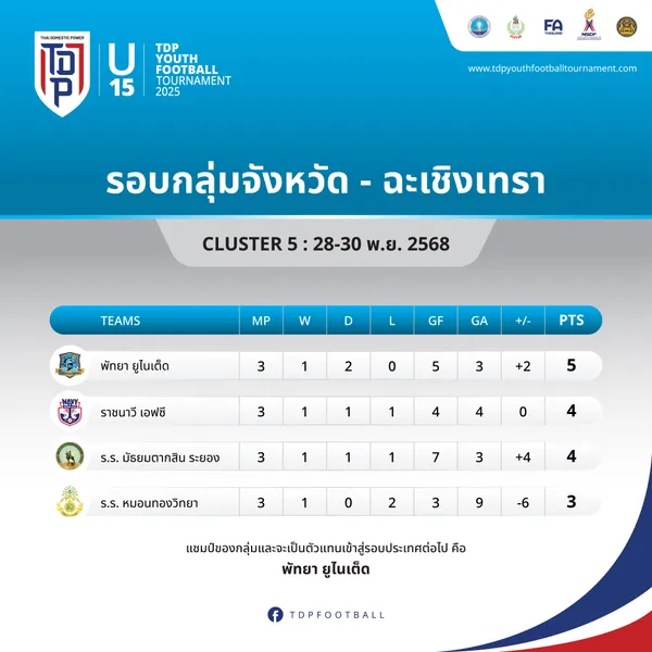 ตากสินระยองเสมอพัทยา ยูไนเต็ด 1-1 ส่งผลให้ พัทยาฯ แข่ง 3 นัด ชนะ 1 เสมอ 2 เก็บ 5 แต้ม คว้าแชมป์คลัสเตอร์ 5 รุ่น U15 พร้อมตั๋วลุยรอบประเทศ