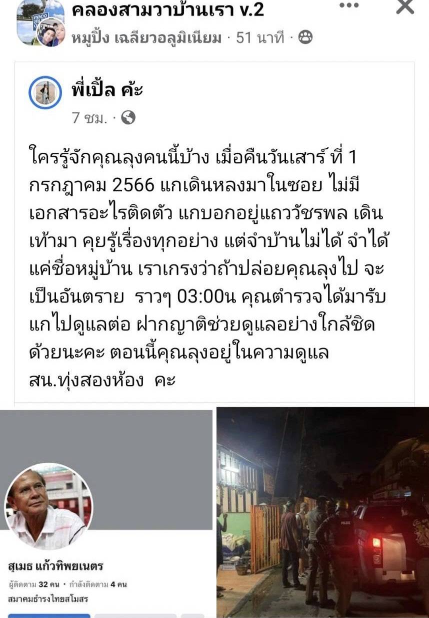 เพจคลองสามวาบ้านเรา v2 เพจชุมชนของชาวบ้าน ย่านคลองสามวา โพสต์โดย ผู้เป็นสมาชิกของกลุ่ม ชื่อ "พี่เปิ้ล ค้ะ" ข้อความว่า ใครรู้จักคุณลุงคนนี้บ้าง เมื่อคืนวันเสาร์ที่ 1 ก.ค. 66 แกเดินหลงมาในซอย ไม่มีเอกสารอะไรติดตัว แกบอกอยู่แถววัชรพล เดินเท้ามา คุยรู้เรื่องทุกอย่าง แต่จำบ้านไม่ได้ จำได้แค่ชื่อหมู่บ้าน เราเกรงว่าถ้าปล่อยคุณลุงไป จะเป็นอันตราย ราว 03.00 น. คุณตำรวจได้มารับแกไปดูแลต่อ ฝากญาติช่วยดูแลอย่างใกล้ชิดด้วยนะคะ ตอนนี้คุณลุงอยู่ในความดูแลของ สน.ทุ่งสองห้อง ค่ะ