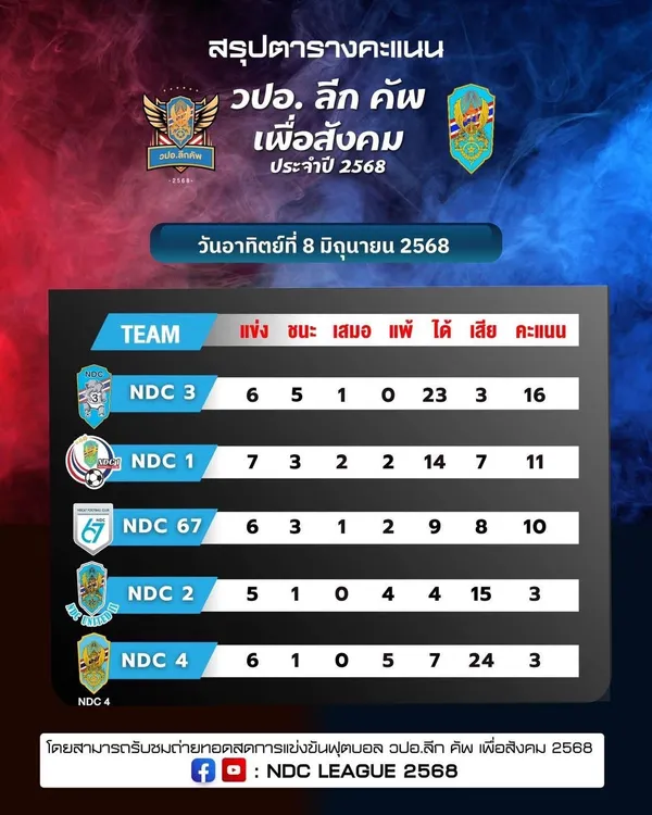 สรุปตารางคะแนน การแข่งขันศึกฟุตบอล วปอ.ลีก คัพ เพื่อสังคม ประจำปี 2568 สิ้นสุด วันอาทิตย์ที่ 8 มิถุนายน 2568