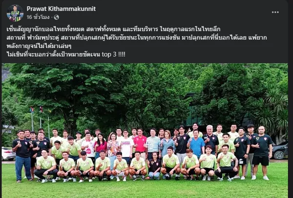 “เซ็นสัญญานักบอลไทยทั้งหมด สตาฟทั้งหมด และทีมบริหาร ในฤดูกาลแรกในไทยลีก สถานที่ฟาร์มพุประดู่ สถานที่ปลุกเสกผู้ได้รับชัยชนะในทุกการแข่งขัน มาปลุกเสกที่นี่ บอกได้เลย แพ้ยาก”
