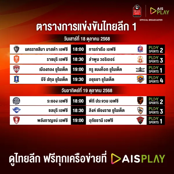 | วันเสาร์ที่ 18 ตุลาคม 2568 | 18.00 น. | นครราชสีมา มาสด้า เอฟซี พบ การท่าเรือ เอฟซี | AIS PLAY SPORTS2 |