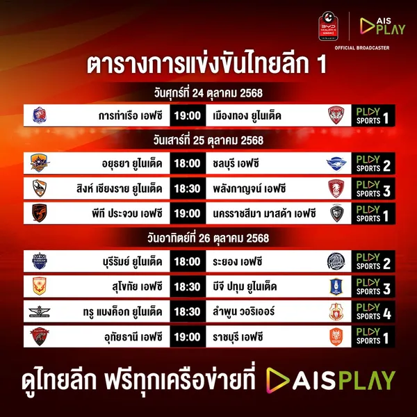 AIS ขอเชิญแฟนฟุตบอลชาวไทยทุกคน ร่วมส่งแรงเชียร์ผ่านช่องทางรับชมที่ถูกลิขสิทธิ์ เพื่อสนับสนุนวงการฟุตบอลไทยอย่างสร้างสรรค์ โดยสามารถชมได้ฟรีทุกเครือข่าย ถ่ายทอดสดครบทุกลีก ที่แอปพลิเคชัน AIS PLAY กล่อง AIS PLAYBOX, Smart TV, Android TV, Apple TV สามารถดาวน์โหลด AIS PLAY ได้ที่ App store และ Google Play Store และถ่ายทอดสดทาง 3BB แฟนบอลไทย ห้ามพลาด! นอกจากนี้สามารถรับชมไฮไลท์และรีรัน ครบทุกช็อตความมันส์ ให้คุณได้เต็มอิ่ม ผ่านทางแอพพลิเคชั่น AIS PLAY เท่านั้น