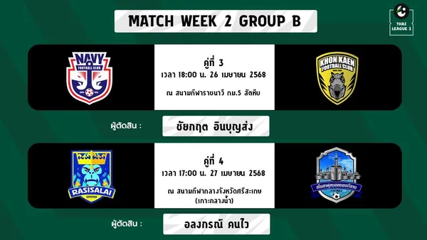 เวลา 18.00 น. สโมสรฟุตบอลราชนาวี พบ ขอนแก่น เอฟซี ที่ สนามกีฬาราชนาวี กม.5 สัตหีบ