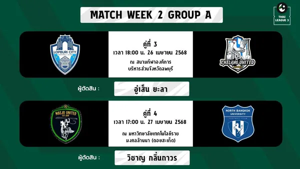เวลา 17.00 น. แม่โจ้ ยูไนเต็ด พบ มหาวิทยาลัยนอร์ทกรุงเทพ ที่ สนามกีฬามหาวิทยาลัยเทคโนโลยีราชมงคลล้านนา (ดอยสะเก็ด)