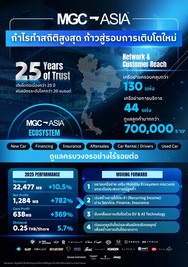MGC-ASIA โชว์ผลงานปี 68 ทำสถิติกำไรสูงสุดใหม่ ชูยุทธศาสตร์รถยนต์ไฟฟ้าและบริการครบวงจร ดันรายได้ Recurring Income โตแกร่ง พร้อมก้าวสู่ยุคยานยนต์อนาคต