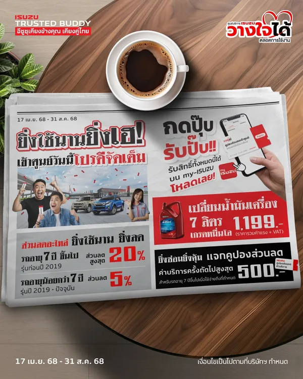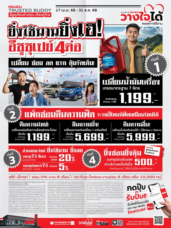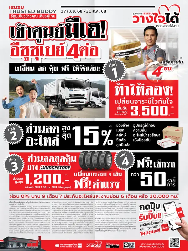 อีซูซุจัดหนัก จัดเต็ม กับแคมเปญสุดพิเศษ "ยิ่งใช้นานยิ่งเฮ! อีซูซุเปย์ 4 ต่อ!" ที่มอบความคุ้มค่าแบบทวีคูณ พร้อมให้คุณประหยัดค่าใช้จ่ายและมั่นใจในทุกการเดินทางยาวนาน