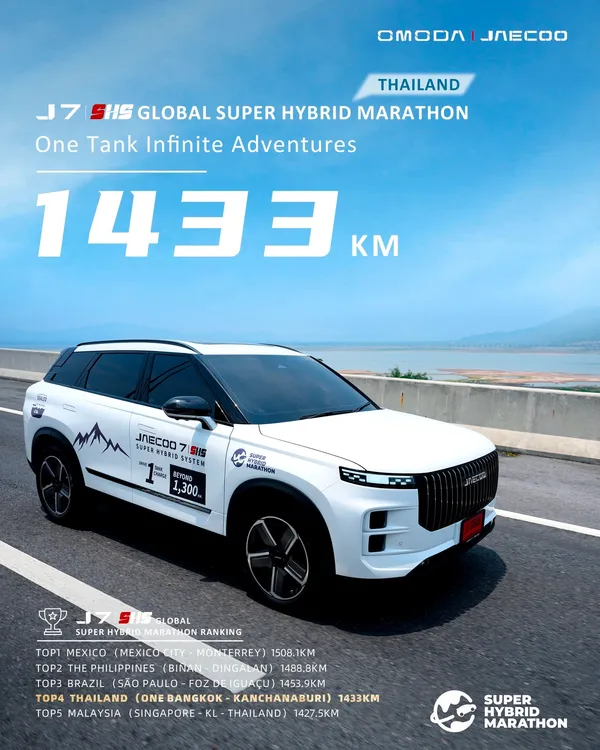 OMODA & JAECOO (อ่านว่า โอโมด้า แอนด์ เจคู่) ภายใต้บริษัท Chery Automobile ผู้นำเทคโนโลยียานยนต์ชั้นนำระดับโลก ประสบความสำเร็จในการทำสถิติอันน่าประทับใจในประเทศไทย กับ JAECOO 7 SHS ตอกย้ำความเป็น No.1 Longest Driving Range* in Thailand ด้วยการทำสถิติวิ่งไกลถึง 1,433 กิโลเมตรด้วยน้ำมันเพียงหนึ่งถังและการชาร์จแบตเตอรี่เพียงครั้งเดียว ได้รับอันดับที่ 4 ของโลก จากการแข่งขันทดสอบการทำสถิติการวิ่งระยะไกล JACOO 7 SHS Global Super Hybrid Marathon