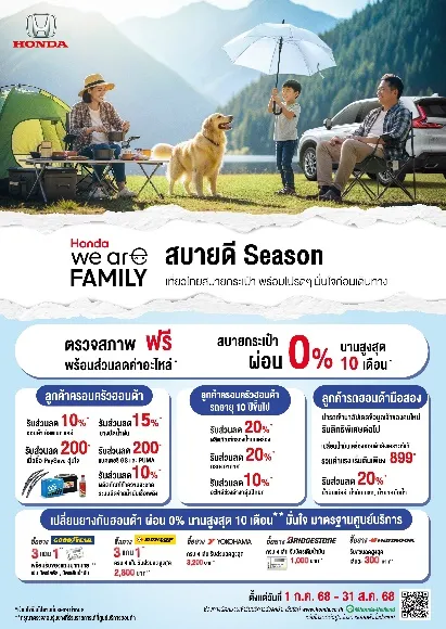 ข้อเสนอพิเศษสุดคุ้มสำหรับลูกค้าที่จองรถยนต์ฮอนด้าตั้งแต่วันที่ 1 กรกฎาคม 2568 - 31 สิงหาคม 2568 และรับรถภายในวันที่ 30 กันยายน 2568 นี้ รีบด่วน! ก่อนตกขบวนความคุ้ม มาสัมผัสรถคันที่ใช่ โปรฟีลกู้ดที่ชอบ ได้ที่งาน FAST Auto Show Thailand 2025 ตั้งแต่วันที่ 2-6 กรกฎาคม 2568 ณ บูทฮอนด้า (B2) ฮอลล์ 102 – 103 ศูนย์นิทรรศการและการประชุมไบเทค หรือรับข้อเสนอพิเศษเดียวกันได้ที่โชว์รูมฮอนด้าทั่วประเทศ