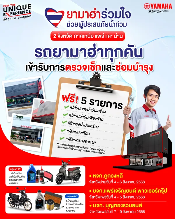 บริษัท ไทยยามาฮ่ามอเตอร์ จำกัด ผู้ผลิต และจำหน่ายรถจักรยานยนต์ชั้นนำของประเทศไทยผนึกกำลังกับร้านผู้จำหน่ายรถจักรยานยนต์ยามาฮ่าในพื้นที่ภาคเหนือ เพื่อให้ความช่วยเหลือและซ่อมบำรุงแก่ผู้ใช้รถจักรยานยนต์ยามาฮ่าที่ได้รับผลกระทบจากเหตุอุทกภัยในพื้นที่จังหวัดน่านและจังหวัดแพร่ โดยจะทำการตรวจเช็กฟรี! 5 รายการ ระหว่างวันที่ 4 - 9 สิงหาคม นี้