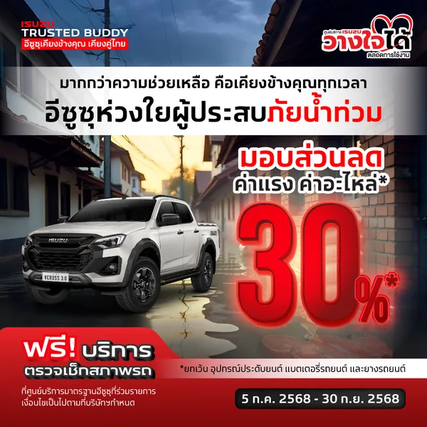 อีซูซุช่วยเหลือผู้ประสบภัยน้ำท่วมภาคเหนือ มอบเงินสนับสนุน 300,000 บาทให้จังหวัดน่าน พร้อมจัดแคมเปญพิเศษให้ลูกค้า ตรวจเช็กรถฟรี พร้อมส่วนลดค่าแรงและค่าอะไหล่ 30%