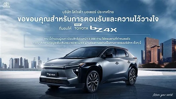 บริษัท โตโยต้า มอเตอร์ ประเทศไทย จำกัด ขอขอบคุณสำหรับการตอบรับและความไว้วางใจ ที่มอบให้ NEW TOYOTA bZ4X ซึ่งล่าสุดเมื่อวันที่ 29 กันยายน 2568 ทางโตโยต้าได้รับยอดผู้ลงทะเบียนสิทธิ์ล่วงหน้าครบตามจำนวน 2,000 ท่าน เป็นที่เรียบร้อยแล้ว