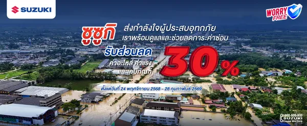 บริษัท ซูซูกิ มอเตอร์ (ประเทศไทย) เร่งช่วยผู้ใช้รถกว่า 15,000 คันใน 9 จังหวัดภาคใต้ที่ประสบภัยน้ำท่วมหนัก ประกาศโครงการ "ซูซูกิร่วมใจ" มอบส่วนลดค่าซ่อม 30% พร้อมส่งทีมช่างผู้เชี่ยวชาญจากส่วนกลางลงพื้นที่บริการด่วน