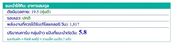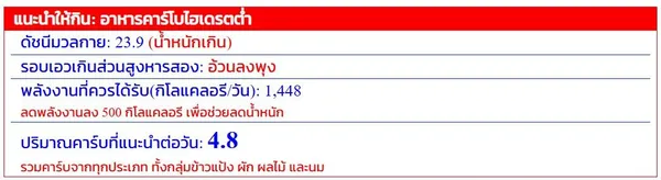 - ในขณะเดียวกัน หากนาย A มี ค่าดัชนีมวลกายปกติ และ รอบเอวปกติ (ไม่ต้องลดน้ำหนัก) ระบบจะแนะนำให้ กินอาหารอย่างสมดุล โดยระบุ ปริมาณคาร์บจากข้าว แป้ง และ คาร์บจากผัก ผลไม้ และนม ที่สามารถเพิ่มได้อย่างเหมาะสม