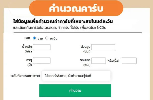 นับคาร์บ.com มีจุดเด่นที่ โปรแกรมคำนวณคาร์บ ตัวช่วยที่ทำให้การนับคาร์บเป็นเรื่องง่าย! โปรแกรมนี้จะประเมิน ปริมาณการกินคาร์โบไฮเดรตที่เหมาะสมต่อวัน โดยประเมินจากข้อมูลส่วนตัว เช่น เพศ น้ำหนัก ส่วนสูง อายุ รอบเอว และ ระดับการมีกิจกรรมทางกาย พร้อมคำนวณตามเกณฑ์มาตรฐานของ กระทรวงสาธารณสุข