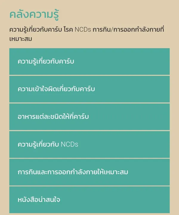 แต่แค่นับคาร์บอย่างเดียวยังไม่พอ เรารู้ว่าหลายคนยังมีคำถามอีกเพียบ เช่น "จริงๆแล้วกินแบบนับคาร์บดีหรือไม่ดี?" "กินขนมปังแทนข้าวได้ไหม?" หรือ "โรคเบาหวานเกี่ยวอะไรกับคาร์บ?" ซึ่งในเว็บ นับคาร์บ.com มีมุม คลังความรู้สุขภาพ ที่รวมบทความน่าสนใจเกี่ยวกับคาร์บ โรค NCDs และเทคนิคการกินที่เหมาะสมเอาไว้