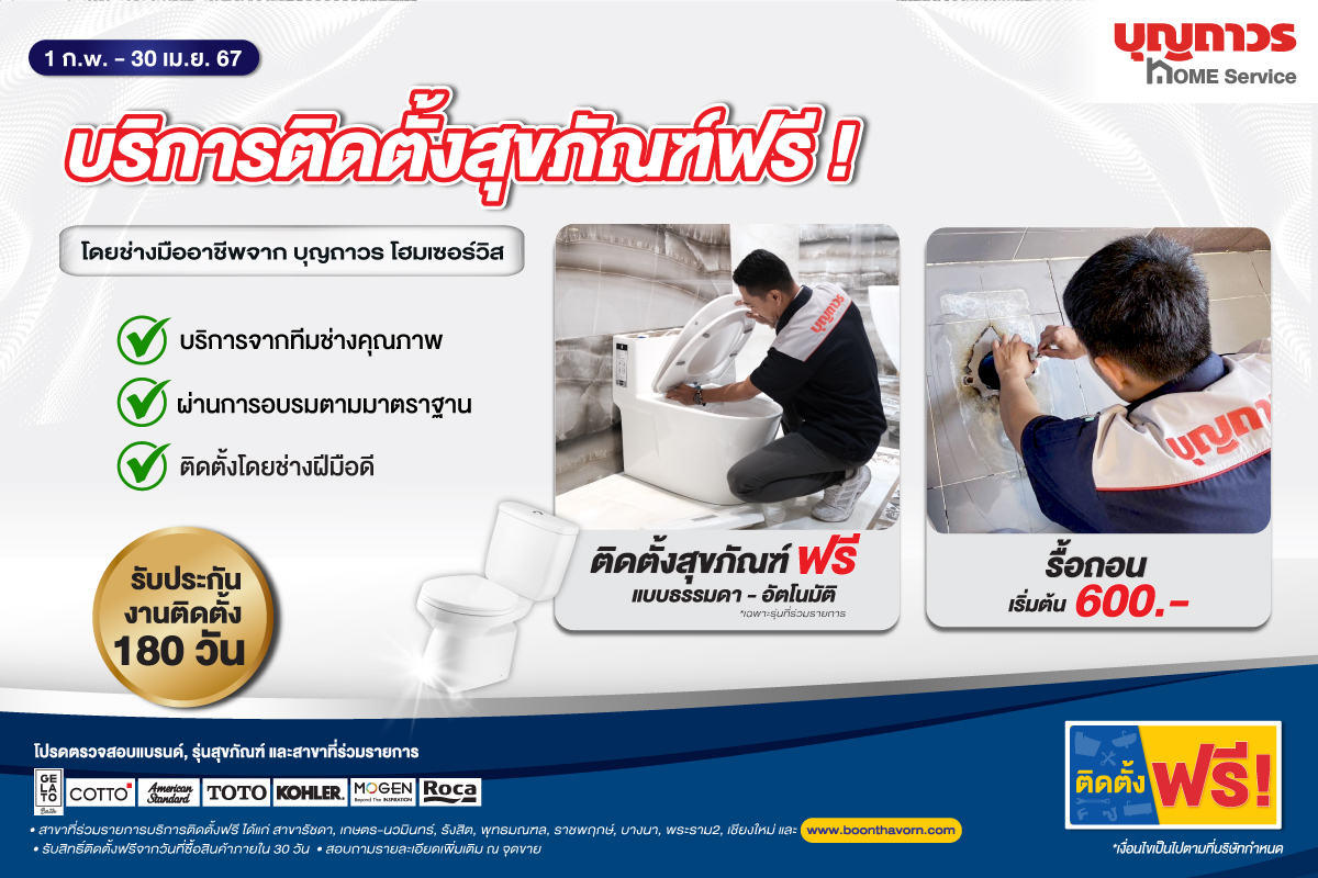 พิเศษ! ฉลองเปิดตัวบริการใหม่ บุญถาวรขอมอบโปรโมชั่นช้อปสุขภัณฑ์จากแบรนด์ชั้นนำที่เข้าร่วมรายการ อาทิ Gelato Bath , TOTO , KOHLER , MOGEN , ROCA , COTTO และ AMERICAN STANDARD รับบริการติดตั้งฟรี!! ตั้งแต่วันที่ 1 ก.พ. – 30 เม.ย. นี้เท่านั้น พร้อมรับประกันงานติดตั้ง 180 วัน สอบถามรายละเอียดเพิ่มเติมและสาขาที่เข้าร่วมรายการได้ที่พนักงานขาย หรือ https://www.boonthavorn.com/sanitary-installation-free ติดตามข้อมูลและข่าวสารต่างๆ ของบุญถาวร ได้ที่เว็บไซต์ : https://www.boonthavorn.com และ facebook boonthavorn
