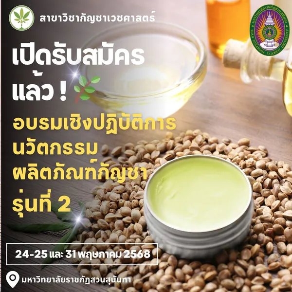สาขาวิชากัญชาเวชศาสตร์ วิทยาลัยสหเวชศาสตร์ มหาวิทยาลัยราชภัฏสวนสุนันทา กำหนดจัดอบรมเชิงปฏิบัติการนวัตกรรมผลิตภัณฑ์กัญชา รุ่น 2 หลักสูตร 6 ผลิตภัณฑ์ เป็นระยะเวลา 3 วัน จำนวน 18 ชั่วโมง ตั้งแต่วันที่ 24 – 25 และวันที่ 31 พฤษภาคม 2568 ณ มหาวิทยาลัยราชภัฏสวนสุนันทา กรุงเทพมหานคร