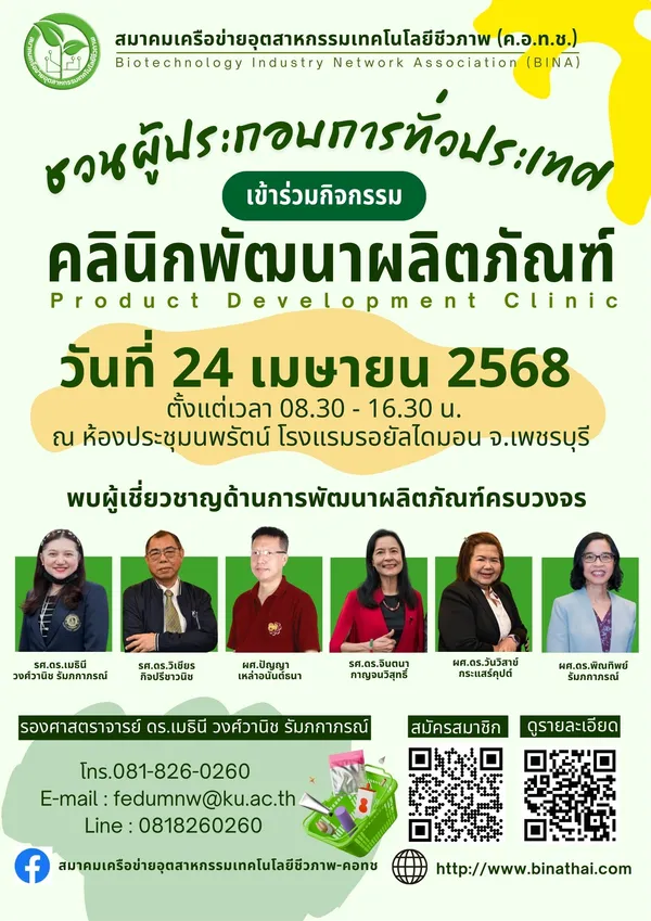 สมาคมเครือข่ายอุตสาหกรรมเทคโนโลยีชีวภาพ (ค.อ.ท.ช.) (Biotechnology Industry Network Association : BINA) ขอเชิญชวนพี่น้องผู้ประกอบการในจังหวัดเพชรบุรี และจังหวัดใกล้เคียง ร่วมกิจกรรม คลินิกพัฒนาผลิตภัณฑ์ ในงานสัมมนา SME SMART UP 2025: SME ไทยเข้มแข็ง สินค้าไทยเติบโต จัดโดย บริษัท ห้องปฎิบัติการกลาง(ประเทศไทย)จำกัด ร่วมกับเครือข่ายจัดกิจกรรมให้ความรู้ด้าน"ฉลากผลิตภัณฑ์อาหาร" บริการทดสอบความชำนาญตามมาตรฐาน lSO ด้านยาสตว์ตกค้างในกลุ่มประมง,สารเร่งเนื้อแดง,โลหะหนักในกลุ่มประมง,สิ่งแวดล้อม,เคมีในอาหาร,พันธมิตรธนาคารของ SME ในการลงทุนและการขายสินค้ายุคใหม่ ในวันที่ วันที่ 24 เมษายน 2568 เวลา 08.30 - 16.00 น. ณ ห้องประชุมนพรัตน์ โรงแรมรอยัลไดมอน จ.เพชรบุรี