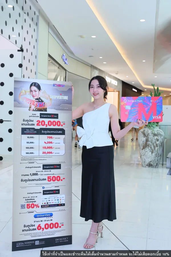 EM DISTRICT SHOPVENTURE จัดขึ้นตั้งแต่วันนี้ – 29 พฤษภาคม 2568 เฉพาะผู้ถือบัตรเครดิต Bangkok Bank M Visa เมื่อช็อปปิ้งในศูนย์การค้า เอ็มโพเรียม, เอ็มควอเทียร์ และเอ็มสเฟียร์ รับคูปองแทนเงินสดสูงสุด 20,000 บาท และเมื่อรับประทานที่ร้านอาหารชั้นนำใน EM DINING และ EM WONDER ครบ 1,000 บาท รับคูปองแทนเงินสด 500 บาท พร้อมรับสิทธิพิเศษ หรือส่วนลดสูงสุด 50% กว่า 30 ร้านอาหารที่ร่วมรายการ นอกจากนี้ยังสามารถแบ่งชำระ 0% นาน 10 เดือนทั้งศูนย์การค้า เมื่อใช้จ่ายตั้งแต่ 10,000 – 200,000 บาท