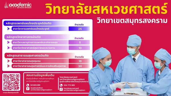 สอบถามรายละเอียดเพิ่มเติมได้ที่ วิทยาลัยสหเวชศาสตร์ มหาวิทยาลัยราชภัฏสวนสุนันทา ศูนย์การศึกษาจังหวัดสมุทรสงคราม โทรศัพท์ : 034-773-905 โทรสาร : 034-773-903 หอพักนักศึกษา : 034-710-724 Email : [email protected] เพจเฟสบุ๊ค https://www.facebook.com/CollegeOfAlliedHealthSciences/?locale=th_TH