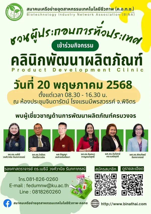 สอบถามรายละเอียดเพิ่มเติมได้ที่ สมาคมเครือข่ายอุตสาหกรรมเทคโนโลยีชีวภาพ รศ.ดร.เมธินี วงศ์วานิช รัมภกาภรณ์ นายกสมาคม โทรศัพท์ 081-826-0260 ติดตามข้อมูลข่าวสารและกิจกรรมดีๆ สมาคมฯ สื่อโซเชียลมีเดียทุกช่องทาง เว็บไซต์ / facebook / youtube / Instargram และ tiktok