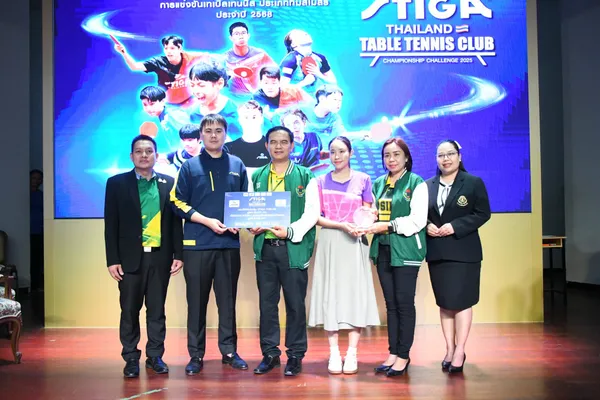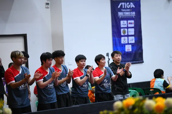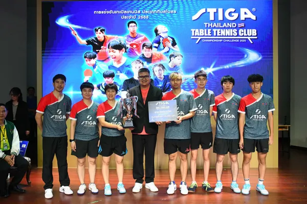 ดร.วีระชัย บุญอยู่ ผู้อำนวยการโรงเรียนเทพศิรินทร์ร่มเกล้า, ดร.ประฏิพัฒน์ แย้มชุติเกิดมณี ประธานสโมสรปิงปองมหาวิทยาลัยธนบุรี, ร.ต.อ.ณัฐชภัทร ศิริพัฒนานันทกูร และคุณณัชชา ทาซ้าย กรรมการ บริษัท ทีเอ็นเอส ปิงปอง ดิสทริบิวเตอร์ จำกัด ตัวแทนจำหน่ายอุปกรณ์ยี่ห้อ STIGA ประจำประเทศไทย, คุณเต็มฟ้า ไชยศิริ เจ้าของร้านอาหารจันทร์รพี เทเวศร์ ร่วมมอบรางวัลการแข่งขันประเภททีมผสมทั่วไป ในศึก 1st STIGA THAILAND TABLE TENNIS CLUB CHAMPIONSHIP CHALLENGE 2025 วันที่ 9-11 พ.ค. 2568 ที่ผ่านมา ณ โรงเรียนเทพศิรินทร์ร่มเกล้า