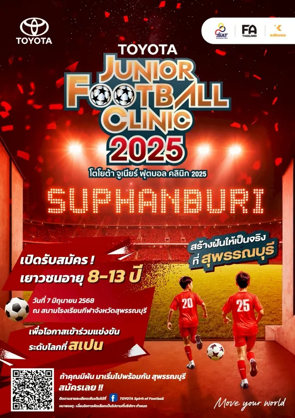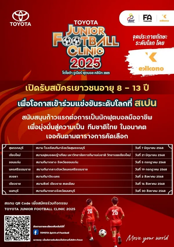 โตโยต้าขอเชิญชวนเยาวชนไทยที่มี ความฝันสู่เส้นทางฟุตบอลอาชีพ เข้าร่วมการแข่งขันคัดเลือกนั กเตะในโครงการ “TOYOTA Junior Football Clinic 2025” ซึ่งเปิดโอกาสให้เยาวชนอายุ 8-13 ปี จากทั่วประเทศได้แสดงศั กยภาพและพัฒนาทักษะฟุตบอลภายใต้ การฝึกสอนของโค้ชระดับโลกจาก EKKONO Academy โดยสามารถสมัครได้ที่ผู้ แทนจำหน่ายโตโยต้า ในจังหวัดที่รับสมัคร ตั้งแต่วันที่ 12 พฤษภาคม 2568 เป็นต้นไป และอีกช่องทางที่รับสมัครพร้ อมติดตามความเคลื่อนไหวได้ที่ Facebook page : Toyota Spirit of Football https://www.facebook.com/ToyotaFootball