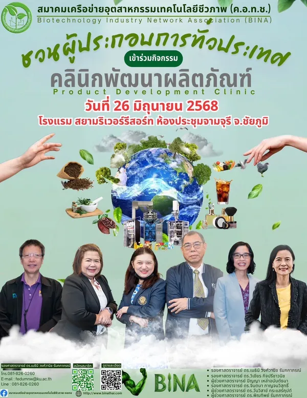สมาคมเครือข่ายอุตสาหกรรมเทคโนโลยีชีวภาพ (BINA) ร่วมกับ บริษัท ห้องปฏิบัติการกลาง (ประเทศไทย) จำกัด (CENTRAL LAB THAI) และมหาวิทยาลัยเกษตรศาสตร์ ขอเชิญชวนเกษตรกร วิสาหกิจชุมชน ผู้ประกอบการ และ SMEs ทั่วประเทศ เข้าร่วมกิจกรรม "คลินิกพัฒนาผลิตภัณฑ์" (Product Development Clinic) ในงานสัมมนา "ยกระดับผู้ประกอบการไทย SME SMART UP 2025 : SME ไทยเข้มแข็ง สินค้าไทยเติบโต" ภายใต้โครงการ "SME ปัง ตังได้คืน" ใน วันพฤหัสบดีที่ 26 มิถุนายน 2568 ตั้งแต่เวลา 08.30 - 15.30 น. ณ ห้องประชุมจามจุรี โรงแรมสยามริเวอร์รีสอร์ท จังหวัดชัยภูมิ