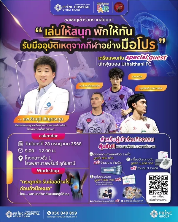 ไฮไลต์สำคัญ คือกิจกรรม "Doctor Talk" ในหัวข้อ “เล่นให้สนุก พักให้ทัน รับมืออุบัติเหตุจากกีฬาอย่างมือโปร!” โดย นายแพทย์ชิตภูมิ เชิญตระกูล ศัลยแพทย์กระดูกและข้อ และ Workshop "กระดูกหัก รับมืออย่างไร...ก่อนถึงมือหมอ" โดยพยาบาลวิชาชีพแผนกอุบัติเหตุ นอกจากนี้ ผู้เข้าร่วมงานยังมีสิทธิ์ลุ้นรับของรางวัลสุดเซอร์ไพรส์ และที่พลาดไม่ได้คือ โอกาสพิเศษที่จะได้ใกล้ชิดกับนักเตะทีม Uthai Thani FC ที่จะมาร่วมสร้างสีสันและแรงบันดาลใจให้หันมาใส่ใจสุขภาพ ตั้งแต่เวลา 9.00-12.00 น. ณ บริเวณโถงกิจกรรมชั้น 1 โรงพยาบาลพริ้นซ์ อุทัยธานี