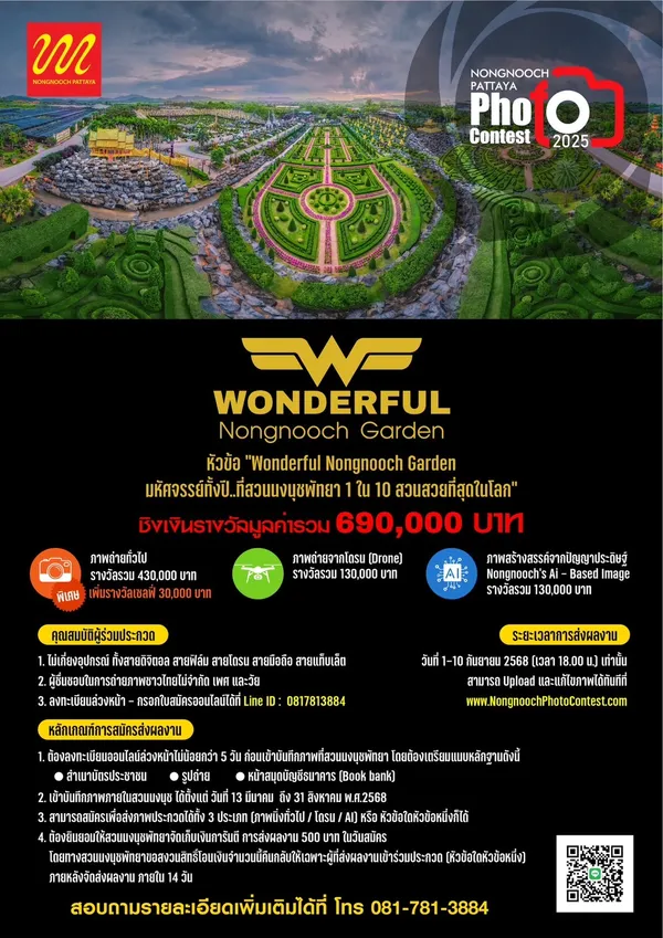 ความชัดเจนของเนื้อหาและเรื่องราวของภาพ, องค์ประกอบภาพที่โดดเด่นและสื่อความหมายได้ดี, ความคิดสร้างสรรค์และการมองมุมใหม่ที่ไม่ซ้ำใคร, ความสอดคล้องกับบรรยากาศและเอกลักษณ์ของสวนนงนุชเปิดรับผลงาน 3 ประเภท
