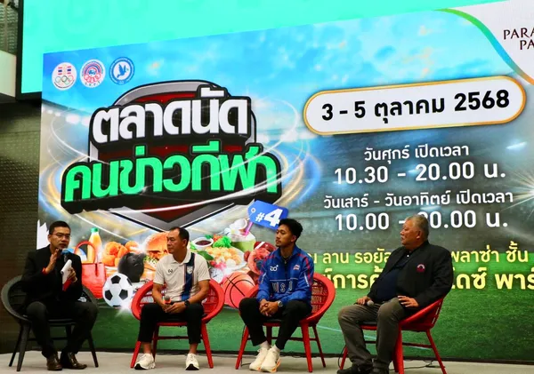มาช้อปชิมสินค้าคุณภาพ ใกล้ชิดคนข่าวและนักกีฬาทีมชาติไทยที่หมุนเวียนสลับกันมาร่วมงาน ในงาน "ตลาดนัดคนข่าวกีฬา ปีที่ 4" ตั้งแต่วันนี้ - วันอาทิตย์ที่ 5 ตุลาคม 2568 เวลา 10.00 น. -20.00 ณ ลานรอยัล พาร์ค พลาซ่า ชั้น 1 ศูนย์การค้าพาราไดซ์ พาร์ค